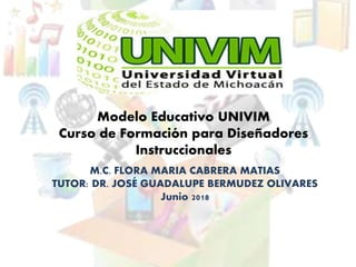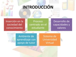 El documento describe el modelo educativo de la UNIVIM, una universidad virtual. El modelo se centra en el estudiante y desarrolla competencias a través de la relación entre tutor y estudiante, contenidos digitales diseñados instruccionalmente, y el uso de TIC. La misión es ofrecer educación de calidad a través de un modelo innovador y flexible que apoya las necesidades regionales.