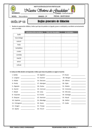 Este documento presenta instrucciones sobre las reglas generales de tildación en español. Explica cómo realizar la separación silábica de palabras y clasificarlas como agudas, graves o esdrújulas. Luego, proporciona varios ejercicios para que los estudiantes coloquen tildes correctamente en palabras sueltas, textos y un breve escrito sobre su infancia resaltando palabras con diferentes tipos de acentuación. El objetivo es reforzar el uso adecuado de la tilde en la ortografía española.