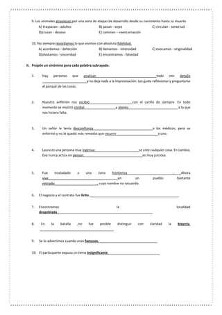 Este documento contiene un ejercicio de sinónimos contextuales para estudiantes de segundo grado. El ejercicio consiste en 3 partes: 1) Subrayar la alternativa que contiene palabras sinónimas que puedan sustituir las subrayadas en los enunciados. 2) Proponer un sinónimo para cada palabra subrayada. 3) Escribir un término en la parte superior de cada imagen y proponer un sinónimo en la parte inferior. El objetivo es practicar el uso de sinónimos en diferentes contextos.