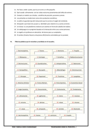 Este documento presenta un ejercicio de acentuación y tildación de palabras compuestas y simples. Se pide acentuar palabras compuestas, subrayar palabras mal tildadas, tildar palabras en un recuadro, emparejar palabras compuestas con sus significados, formar nuevas palabras compuestas y definir términos. El ejercicio tiene como objetivo practicar la acentuación y tilde diacrítica en palabras y expresiones del idioma español.