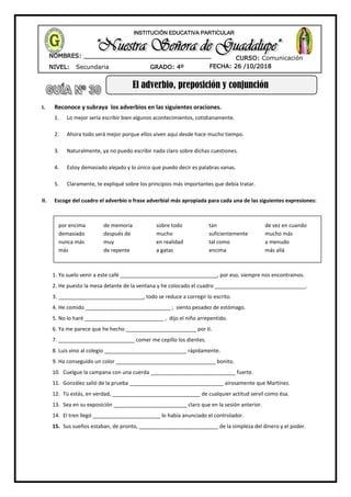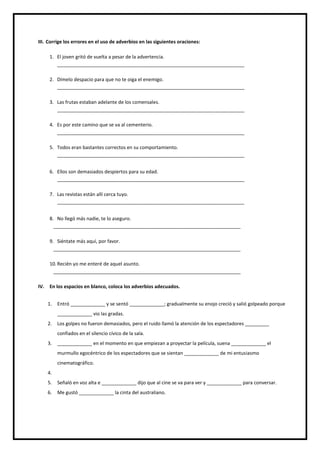 Este documento presenta una lección sobre adverbios, preposiciones y conjunciones. Incluye ejercicios para identificar y clasificar estos elementos gramaticales en oraciones dadas, así como corregir errores en su uso. También proporciona instrucciones para crear un cuento infantil utilizando estos elementos de manera destacada.