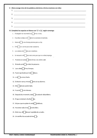 Este documento presenta un ejercicio de comunicación sobre el uso de las grafías G, J, LL y Y en palabras españolas. Consiste en once secciones que incluyen completar oraciones y textos con las grafías correctas, conjugar verbos, y formar oraciones con palabras provistas. El objetivo es reforzar el conocimiento y uso adecuado de estas letras en el idioma.