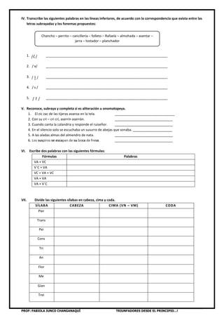 Este documento presenta un examen de comunicación y lenguaje que incluye varias secciones sobre los elementos de la comunicación, comunicación verbal y no verbal, transcripción fonética, reconocimiento de figuras literarias como aliteración y onomatopeya, formación de palabras, morfología y sintaxis. El examen contiene ejercicios para identificar partes de la comunicación, transcribir palabras en fonemas, reconocer morfemas flexivos y formas gramaticales.