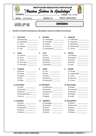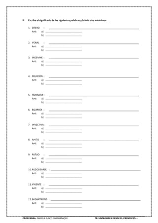 Este documento presenta un ejercicio de sinónimos y antónimos para estudiantes de quinto grado. El ejercicio contiene tres secciones: 1) Identificar sinónimos y subrayar antónimos de palabras dadas. 2) Escribir definiciones de palabras y dar dos antónimos cada una. 3) Aparear antónimos dados y escribirlos. El objetivo es que los estudiantes practiquen reconocer sinónimos y antónimos.