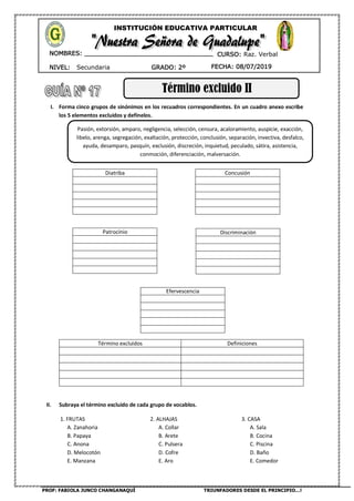 Este documento presenta un ejercicio de razonamiento verbal para estudiantes de secundaria. El ejercicio consiste en formar grupos de sinónimos y seleccionar el término excluido en cada grupo. También incluye la definición de cinco términos excluidos. Otra sección pide identificar ideas clave y conceptos excluyentes en un texto sobre el uso adecuado de registros lingüísticos. El objetivo es practicar la habilidad de distinguir términos relacionados de los que no lo están.