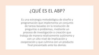 El documento describe el aprendizaje basado en proyectos (ABP) como una estrategia educativa que involucra a los estudiantes en la resolución de problemas o preguntas a través de un proceso de investigación que culmina en un producto final. Explica que el ABP implica cuatro pasos: 1) activación del tema, 2) investigación, 3) desarrollo y 4) presentación. También destaca los roles del docente en guiar el proceso y evaluarlo a través de portafolios, diarios y rúbricas.