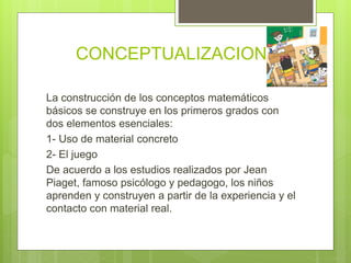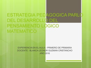 El documento describe una estrategia pedagógica para el desarrollo del pensamiento lógico matemático en estudiantes de primer grado. La estrategia se basa en el uso de material concreto y juegos, como lo recomienda Jean Piaget, para que los estudiantes construyan conceptos matemáticos a través de la experiencia. La docente planifica juegos para objetivos como resolver problemas, establecer relaciones cuantitativas y fomentar el aprendizaje colaborativo. La estrategia permite a los estudiantes