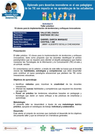 Este documento presenta un taller práctico sobre 10 claves para la implementación de tendencias y enfoques innovadores en la educación. El taller tiene como objetivo que los docentes identifiquen los cambios necesarios para incorporar las TIC al aula y currículo escolar. El taller se desarrollará de forma teórico-práctica y cubrirá temas como métodos para fomentar la creatividad docente, nuevas habilidades del siglo XXI y tendencias educativas basadas en pedagogía y tecnología.