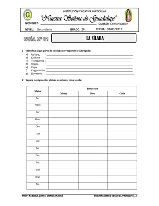 Este documento presenta un ejercicio de identificación de sílabas en palabras. Los estudiantes deben identificar si una letra subrayada corresponde a la cabeza, cima o coda de la sílaba. También deben separar palabras en sílabas y marcar las tónicas y atonas. El ejercicio contiene 27 palabras para separar en sílabas.