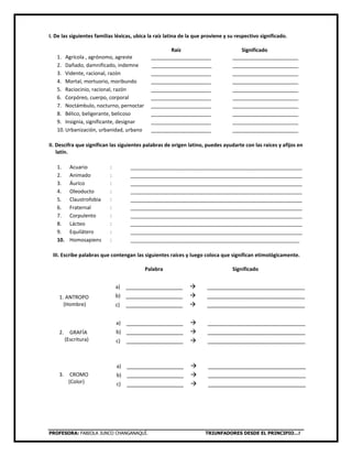 Este documento presenta una lista de raíces latinas comunes y sus significados, seguido de ejercicios para que los estudiantes identifiquen palabras derivadas de estas raíces y sus significados. Los ejercicios incluyen identificar palabras relacionadas con diferentes raíces latinas, descifrar el significado de palabras basadas en sus raíces, y relacionar prefijos griegos y latinos con sus significados.