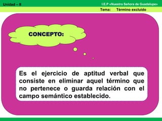 El documento presenta varios ejemplos de ejercicios de términos excluidos pertenecientes a diferentes campos semánticos como la sinonimia, morfología, definición, sinónimo-antónimo y rasgos gramaticales. Además, proporciona una tarea domiciliaria en la que los estudiantes deben subrayar el término excluido en una serie de ejemplos.