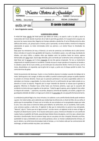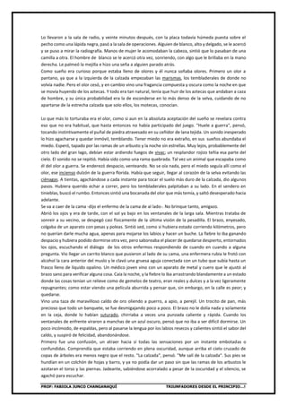 Este documento presenta un cuento tradicional dividido en varias secciones. Narra la historia de un hombre que sufre un accidente en motocicleta y es llevado al hospital. Mientras está inconsciente, tiene una serie de sueños en los que se ve a sí mismo como un guerrero indígena que huye de cazadores aztecas a través de un pantano oscuro. Finalmente despierta en el hospital, donde se recupera lentamente de sus heridas.