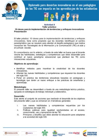 Este taller busca que los docentes identifiquen el cambio paradigmático requerido para incorporar las TIC al aula y currículo. Se espera que los docentes desarrollen habilidades, estrategias y competencias para contribuir al nuevo paradigma educativo que plantean las TIC. El taller se desarrollará de forma teórico-práctica apoyada en trabajo individual y colaborativo, abordando temas como las nuevas habilidades del siglo XXI, políticas de acceso a TIC e innovación educativa.