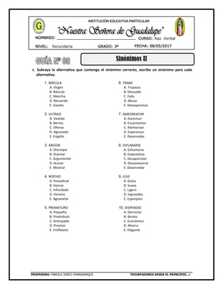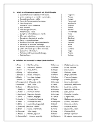 Este documento presenta un examen de sinónimos para estudiantes de tercer grado. Consiste en tres secciones que piden a los estudiantes identificar sinónimos, asignar definiciones a palabras y emparejar palabras con sus sinónimos correspondientes. El examen contiene más de 40 pares de palabras para que los estudiantes demuestren su comprensión de los sinónimos.
