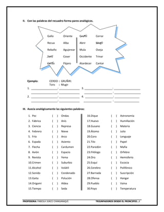 Este documento presenta un examen de analogías para estudiantes de segundo grado de secundaria. Consiste en tres secciones que piden a los estudiantes completar pares de palabras analógicas. La primera sección presenta 8 pares de palabras y pide a los estudiantes escribir pares analógicos. La segunda sección presenta palabras sueltas y pide formar pares analógicos. La tercera sección presenta 30 palabras y pide asociarlas analógicamente con opciones dadas.