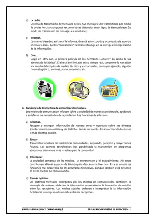 Este documento describe los medios de comunicación masivos, incluyendo sus características, tipos y funciones principales. Los medios de comunicación masivos son aquellos que pueden enviar mensajes a grandes cantidades de público en poco tiempo, como la televisión, radio, prensa escrita, libros, cine e internet. Estos medios informan, educan, entretienen y ayudan a formar opiniones entre los receptores, además de servir como herramienta de publicidad y propaganda. También ejercen gran influencia sobre el lenguaje al dif