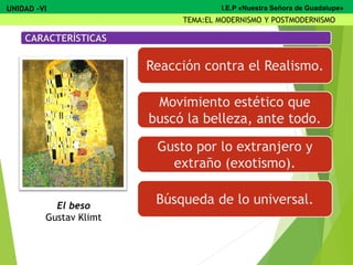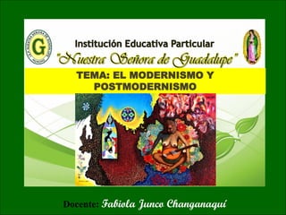 El documento describe el Modernismo y Postmodernismo en la literatura. El Modernismo surgió como reacción contra el Realismo y buscaba la belleza sobre todo. Se caracterizaba por el gusto por lo extranjero y extraño. Algunos representantes importantes fueron José Martí y Rubén Darío. El Postmodernismo rechazó el lenguaje rebuscado del Modernismo e incorporó espacios narrativos más sencillos y personales. El movimiento literario Colónida surgió en el Perú en 1915-1916 e impulsó a jóvenes escritores de