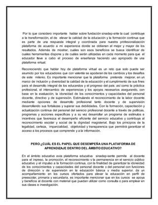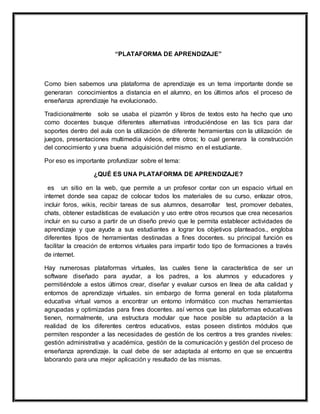 Una plataforma de aprendizaje es un sitio web que permite a los profesores crear cursos virtuales con materiales, foros, tareas y otras herramientas. Estas plataformas han evolucionado para apoyar la enseñanza a distancia y complementar la enseñanza tradicional en el aula. La plataforma Sinadep-Snte ofrece cursos y recursos educativos para apoyar el desarrollo profesional continuo de los docentes.