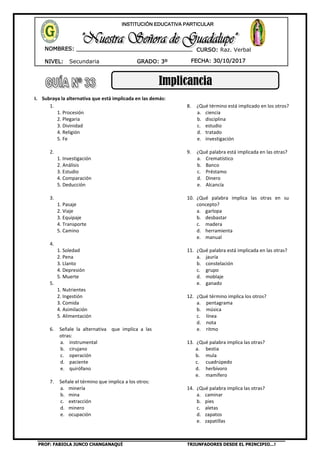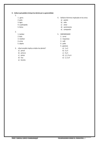 Este documento presenta un examen de Razonamiento Verbal para estudiantes de tercer grado de secundaria. Consiste en 14 preguntas que piden identificar términos implicados o incluidos en otros términos dados como opciones. Las preguntas cubren temas como religión, ciencia, minería, música, animales y alimentos. El objetivo es evaluar la capacidad de los estudiantes para deducir relaciones lógicas entre conceptos.