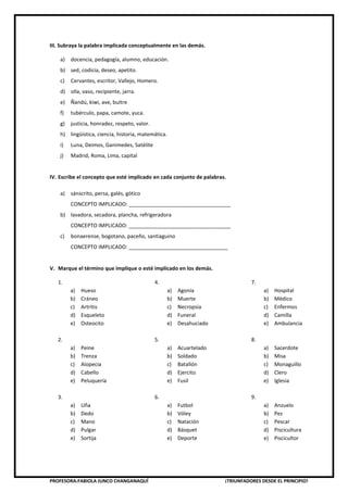 Este documento presenta un examen de razonamiento verbal sobre el concepto de implicancia. Consiste en 6 secciones con preguntas sobre identificar palabras implicadas conceptualmente en otras, marcar términos implicados o que implican a los demás, y subrayar alternativas correctas relacionadas con implicancias conceptuales. El examen evalúa la comprensión de los estudiantes sobre cómo un concepto puede estar contenido o ser necesario para otro concepto.