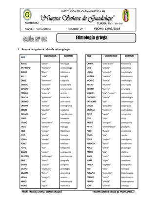 El documento presenta una tabla con raíces griegas comunes y sus significados en inglés. Luego proporciona ejercicios para que los estudiantes relacionen las raíces con sus definiciones. El propósito es que los estudiantes practiquen y aprendan el significado de las raíces griegas frecuentes, lo cual les permitirá descifrar el significado de palabras derivadas del griego.
