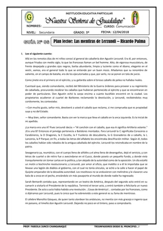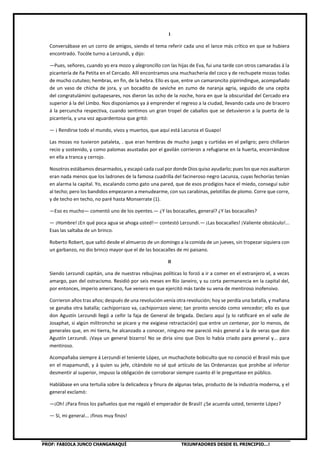 Este documento presenta un cuento de Ricardo Palma titulado "Las mentiras de Lerzundi" sobre el general Agustín Lerzundi, conocido por contar mentiras de forma ingeniosa. Relata algunas de sus historias, como cuando reclamó caballos del ejército encontrando excusas para todas las marcas, o cuando escapó de bandidos saltando de techo en techo en Lima. También cuenta cómo el teniente López siempre corroboraba sus mentiras hasta que quiso contar una él y fue castigado por Lerzundi, que no