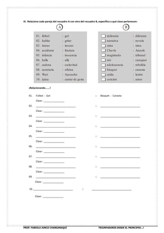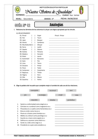 Este documento presenta un ejercicio de analogías para estudiantes de primer grado de secundaria. Consiste en tres secciones: 1) Relacionar términos en columnas A y B usando lógica, 2) Completar frases con palabras dadas relacionándolas por su significado, 3) Emparejar parejas de palabras de dos recuadros clasificándolas por su tipo de relación. El objetivo es que los estudiantes desarrollen habilidades de razonamiento lógico y comprensión de relaciones conceptuales.