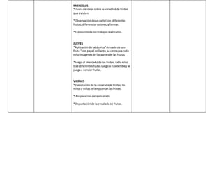 Este documento describe una experiencia de aprendizaje de una semana para niños de 3 a 4 años sobre las frutas. El objetivo es que los niños conozcan los beneficios, sabores, olores y usos de las frutas a través de diversas actividades como canciones, cuentos, juegos e identificación de colores y formas. Las actividades propuestas incluyen conversaciones sobre frutas, interpretación de canciones, observación de carteles con frutas, exposición de dibujos, juegos de roles como ir al mercado