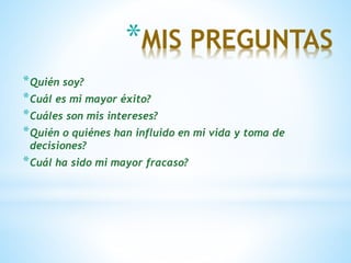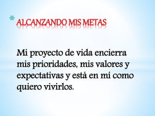Este documento describe el proyecto de vida de una persona, incluyendo sus prioridades, valores y expectativas. La persona reflexiona sobre quién es, cuáles han sido sus mayores éxitos y fracasos, e identifica que le gusta su forma de ser, hacer las cosas bien y ser buena amiga. Concluye que se esfuerza por lograr sus objetivos, mejorarse cada día, y que su familia la apoya, aunque desea mejorar sus conocimientos en tecnologías de la información.