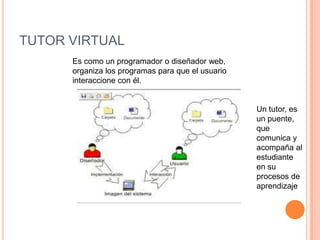 El documento describe el rol de un tutor virtual. Un tutor virtual es responsable de mediar la educación a través de un entorno virtual, actuando como intermediario entre los contenidos y los estudiantes de una manera orientadora y facilitadora para promover el aprendizaje autónomo. Un tutor virtual debe estar constantemente capacitándose, conocer a los estudiantes a pesar de no estar frente a frente, fomentar la interrelación entre los participantes, y estar disponible para responder dudas y necesidades de los estudiantes de manera oportuna.