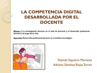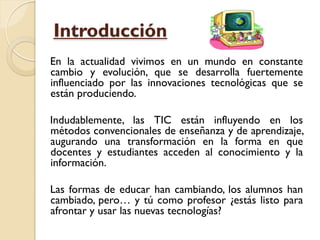 Este documento describe la importancia del desarrollo profesional de los docentes en el uso de las tecnologías de la información y la comunicación (TIC) en la enseñanza. Explica que los docentes deben desarrollar competencias como planificar el currículo integrando las TIC, proponer actividades que las utilicen y evaluar su uso. También identifica obstáculos comunes como la falta de formación y saturación de información. El papel del docente con la inclusión de las TIC será de consultor, tutor y diseñador de experiencias de apre