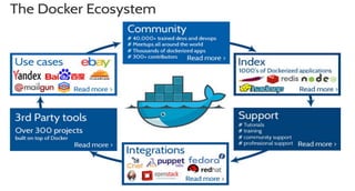 Docker permite encapsular cualquier información y hacerla portátil, autosuficiente y ligera de forma que se pueda ejecutar de manera consistente en cualquier hardware. Esto resuelve el problema de tener que adaptar aplicaciones a múltiples entornos y "stacks", permitiendo "crear una vez y ejecutar en cualquier parte". Docker funciona creando contenedores ligeros que comparten recursos del sistema operativo.