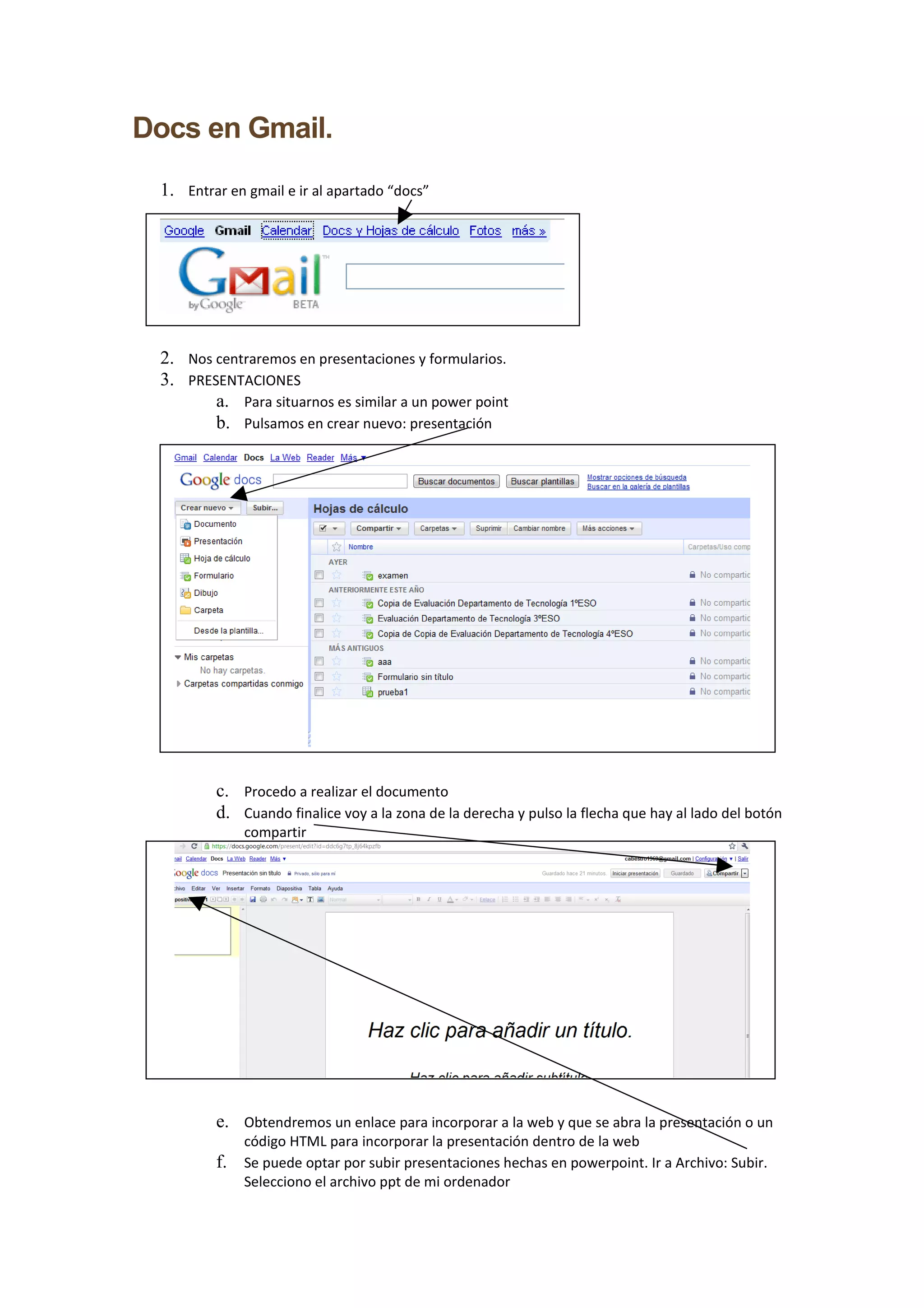 Este documento proporciona instrucciones sobre cómo crear y compartir presentaciones y formularios en Google Docs. Explica cómo crear una nueva presentación o formulario, agregar contenido y opciones de respuesta, y obtener un enlace o código HTML para incorporar el documento en un sitio web. También menciona cómo cargar presentaciones de PowerPoint existentes a Google Docs.