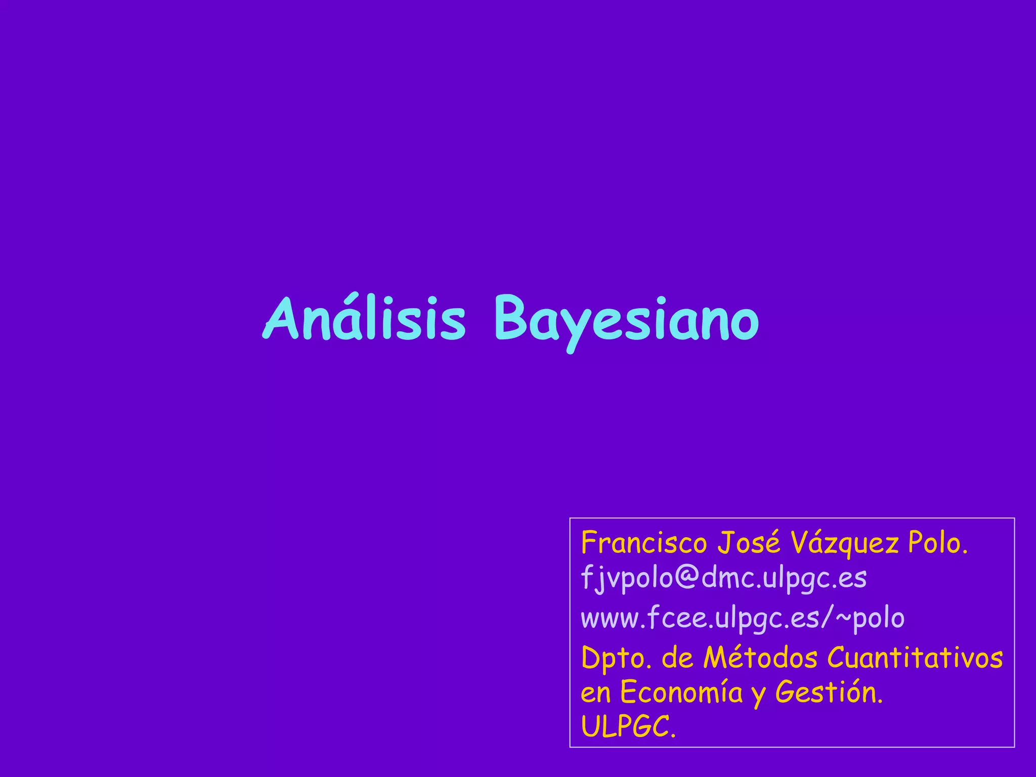 Este documento presenta una introducción al análisis bayesiano. Explica los conceptos básicos como la distribución a priori, la verosimilitud y la distribución a posteriori usando el teorema de Bayes. También describe la inferencia bayesiana conjugada y proporciona ejemplos de estimación de proporciones usando un modelo Beta-Binomial y de medias usando un modelo Normal-Normal.