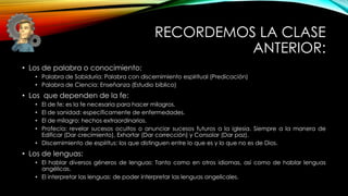 • Profecía: revelar sucesos ocultos o anunciar sucesos futuros a la iglesia. Siempre a la manera de