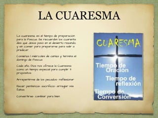 La Cuaresma es el tiempo de preparación de 40 días antes de la Pascua que conmemora los 40 días que Jesús pasó en el desierto. Comienza el Miércoles de Ceniza y termina el Domingo de Pascua. La Semana Santa recuerda los últimos días de Jesús antes de su crucifixión y resurrección, incluyendo su entrada triunfal a Jerusalén, la Última Cena, su crucifixión y sepultura el Viernes Santo, y su resurrección el Domingo de Pascua.