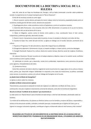El documento resume los principales documentos de la doctrina social de la Iglesia, incluyendo Rerum Novarum de 1891 que trata sobre la justicia de los trabajadores, la propiedad privada y el derecho de asociación. Otros documentos abordan temas como el orden económico, la justicia social, la paz, el desarrollo humano integral y la solidaridad. En general, los documentos promueven valores cristianos como el amor, la justicia y la paz en respuesta a revoluciones políticas, económicas y culturales.