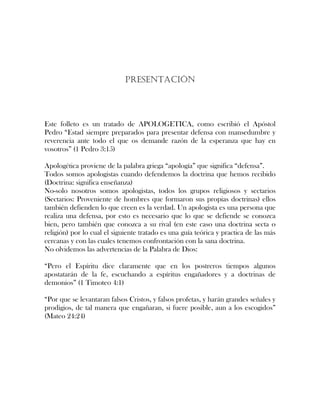 El documento es un tratado de apologética que analiza diversas doctrinas, sectas y religiones, enfocándose en la defensa de la fe cristiana ante la proliferación de creencias falseadas. A través de definiciones y ejemplos, se abordan características y fundamentos de religiones como el mormonismo y los testigos de Jehová, así como la necesidad de la defensa activa de la sana doctrina. Además, se subraya la importancia de estar preparados para evangelizar y contrarrestar las enseñanzas de las sectas.
