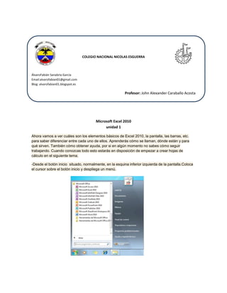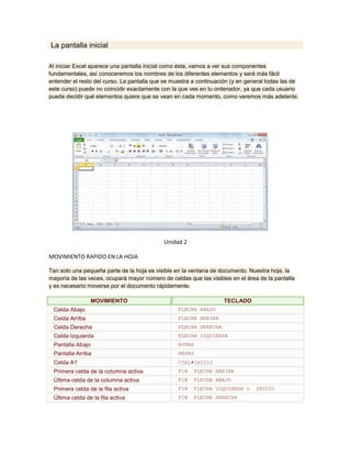 Este documento presenta las primeras tres unidades de un curso de Microsoft Excel 2010. La unidad 1 describe los elementos básicos de la interfaz de Excel como la pantalla, las barras y cómo obtener ayuda. La unidad 2 explica cómo moverse rápidamente por una hoja usando teclas de dirección y comandos. La unidad 3 cubre cómo introducir datos, guardar archivos y cerrar libros de trabajo.