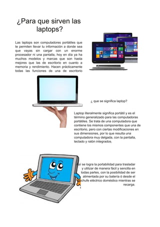 Las laptops son computadoras portátiles que permiten llevar la información a cualquier lugar de manera fácil y cómoda. Contienen los mismos componentes que una computadora de escritorio pero en un tamaño más delgado con la pantalla, teclado y ratón integrados para lograr portabilidad. Las laptops funcionan con batería o conectadas a un enchufe eléctrico y requieren carga periódica de la batería para su uso móvil.