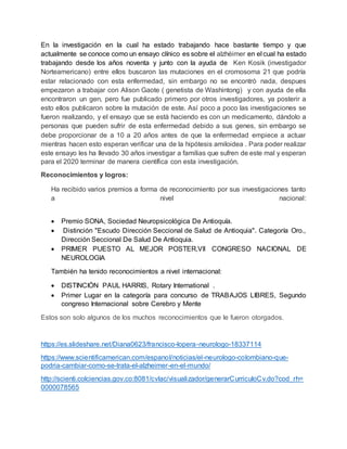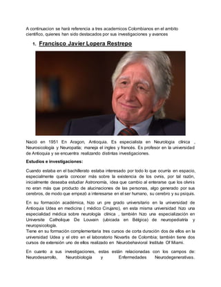Este documento destaca a tres académicos colombianos en el ámbito científico: Francisco Javier Lopera Restrepo, experto en neurología clínica y neuropsicología, quien ha trabajado en el estudio del Alzheimer; Ángela Restrepo Moreno, reconocida micóloga que ha investigado el hongo Paracoccidioides y otros temas de microbiología; y Nubia Muñoz, patóloga y epidemióloga nombrada candidata al Nobel por su investigación en el virus del papiloma humano relacionado con el cáncer de cuello uterino. Todos han recibido múltiples reconocimientos nacionales e internacionales por sus contribuciones a la ciencia. Sus investigaciones abarcan desde enfermedades neurodegenerativas hasta estudios sobre infecciones y cáncer, marcando un impacto significativo en el avance científico.