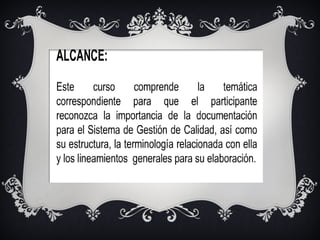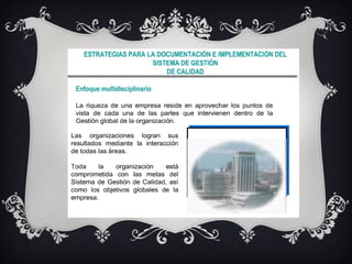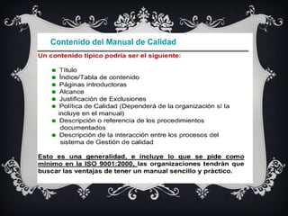 Este documento proporciona información sobre la implementación de un sistema de gestión de calidad ISO 9001, incluyendo procedimientos documentados, mapeo de procesos y diagramas de flujo. Explica los requisitos para documentar procedimientos, así como los beneficios del mapeo de procesos para mejorar la comprensión y comunicación de los flujos de trabajo. También enumera los procedimientos específicos que deben documentarse de acuerdo con la norma ISO 9001.