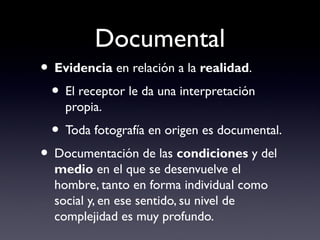 Este documento describe la fotografía documental y su objetivo de capturar evidencia de la realidad tal como es. La fotografía documental registra las condiciones y el entorno en que vive el hombre de forma individual y social. Busca reflejar espacios y condiciones sociales para generar conciencia pública y comprensión de la humanidad.