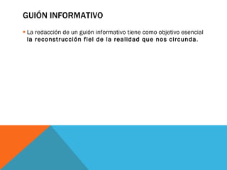 El documento describe diferentes tipos y características de guiones y producciones audiovisuales informativas. Explica el proceso de creación de un guión, incluyendo la propuesta, el tratamiento, el bosquejo por secuencias y la narrativa. También clasifica los documentales según su propósito (informativo, persuasivo, reflexivo), su enfoque de interés (social, histórico, de naturaleza) e intención de exposición (científico, divulgativo, de entretenimiento).