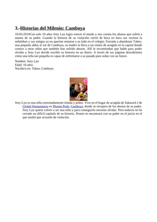 La familia Mendoza vive en extrema pobreza en Guatemala y uno de sus hijos sufre malnutrición. Abel es un niño de 14 años en Perú que trabaja en una ladrillera pero asiste a la escuela por las tardes para cambiar su futuro. Srey Lyn es una niña de 10 años en Camboya que sufrió abusos por parte de su padre y ahora vive en un hogar de acogida, donde escribe un diario para enfrentarse a su pasado.