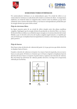 Este documento describe los conceptos básicos de los semiconductores intrínsecos. Explica que un semiconductor intrínseco es un semiconductor puro como un cristal de silicio compuesto solo de átomos de silicio. A temperatura ambiente, este cristal se comporta como un aislante con solo unos pocos electrones libres y huecos producidos por la energía térmica. Luego describe cómo los electrones y huecos se mueven a través del cristal cuando se aplica una carga eléctrica, con los electrones moviéndose hacia placas carg