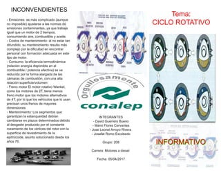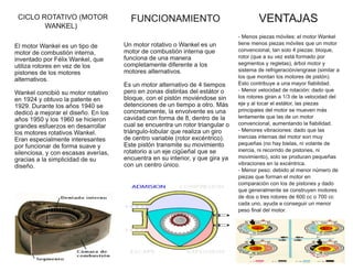 Este documento resume las características principales del motor rotativo Wankel. El motor Wankel utiliza rotores en lugar de pistones y fue inventado por Félix Wankel en 1924. El documento describe las ventajas e inconvenientes del motor, incluyendo menos piezas móviles, menor velocidad de rotación y menor peso como ventajas, pero mayores emisiones contaminantes y costos de mantenimiento como inconvenientes. También explica brevemente cómo funciona el motor rotativo a través del movimiento de un rotor triangular dentro de una cavidad en forma de ocho.