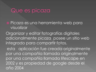 Picaza es una herramienta web para visualizar, organizar y editar fotografías digitales. Fue creada originalmente en 2002 por Lifescape y ahora es propiedad de Google. Picaza se puede integrar con Google y Gmail, y permite subir videos editados directamente a YouTube. Un megapíxel equivale a un millón de píxeles y se usa para expresar la resolución de cámaras digitales. Slideshare es un sitio web para compartir presentaciones de diapositivas, documentos y portafolios de manera pública o privada.