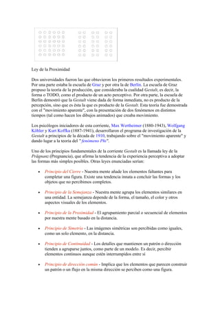 1) La psicología de la Gestalt surgió en Alemania a principios del siglo XX y se centra en cómo la mente organiza y percibe la información de forma holística. 2) Explica varios principios clave como la ley del cierre, la proximidad y la simetría. 3) La teoría de la Gestalt sostiene que el todo es más que la suma de sus partes y que nuestra percepción se organiza en patrones significativos.