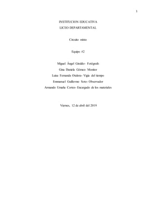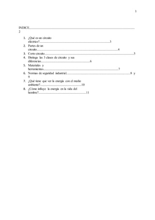 Este documento trata sobre circuitos eléctricos. Explica qué es un circuito eléctrico, sus partes principales como generadores, conductores y receptores. También describe cortocircuitos, las tres clases de circuitos (serie, paralelo y mixto) y sus diferencias. Finalmente, detalla materiales y herramientas necesarias para construir circuitos eléctricos, así como normas básicas de seguridad industrial.